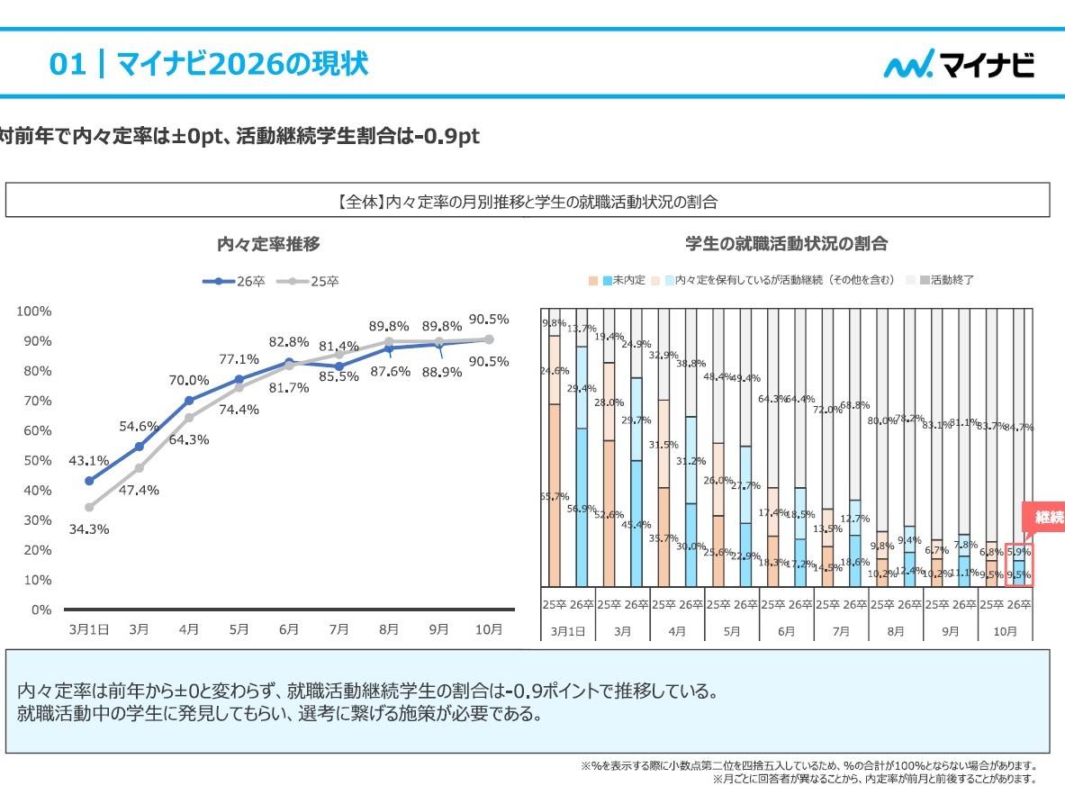 マイナビ26の調査では、2025/11/末時点で就活継続中の学生は、全体の15%はまだ就活しています!アンケートに答えてない学生もいると思うので、水面下ではもう少し就活継続している学生がいると思われます。ここでは、マイナビ26を使って、母集団を増やす方法について2つ紹介します!
