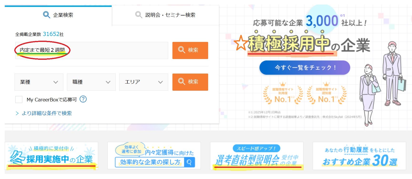 「冬採用実施中」「内定まで最短2週間」このワードを伝言板に掲載すると、マイナビトップ画面の下記の